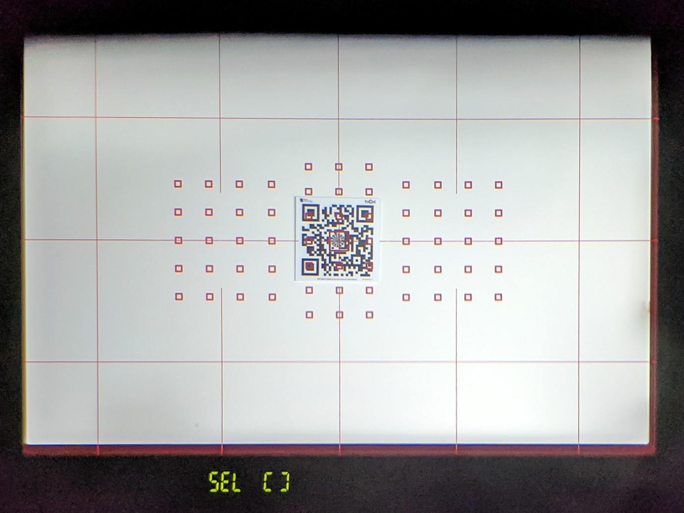 The target should be firmly attached to a vertical surface at the same height at the camera lens. The Target Setup utility will help you ensure the target is in the correct position, but to get a good initial position you should look through the camera viewfinder and position the centre focus point over the middle of the target as shown below:
